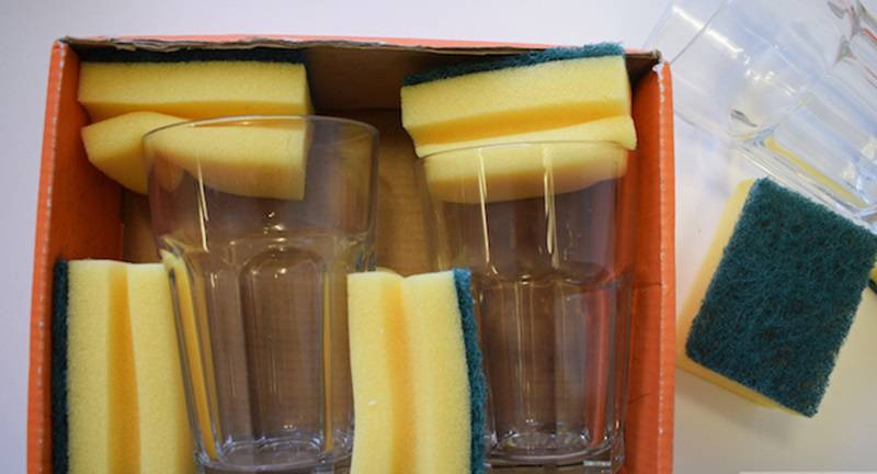 Bạn hãy đặt đồ dùng vào hộp, sau đó lót miếng rửa chén xung quanh sao cho khi nhấc lên, đặt xuống, di chuyển qua lại bên trong hộp không bị va chạm mạnh thì đồ dùng sẽ không bị nứt.