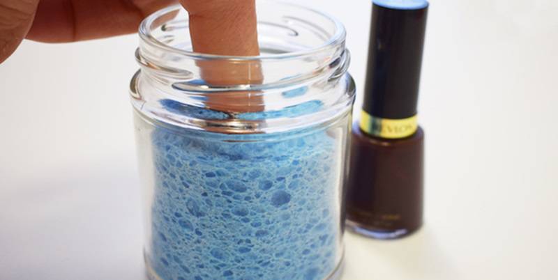 Bạn có thể cắt gọt các cạnh của miếng bọt biển, sau đó nhét nó vào một chiếc lọ có miệng rộng, rồi đổ dung dịch tẩy rửa thấm hết miếng bọt biển sau đó bạn chọt từng đầu ngón tay vào miếng bọt biển thấm chất tẩy rửa, xoay nhẹ để miếng bọt biển cọ rửa làm sạch hết sơn trên móng.